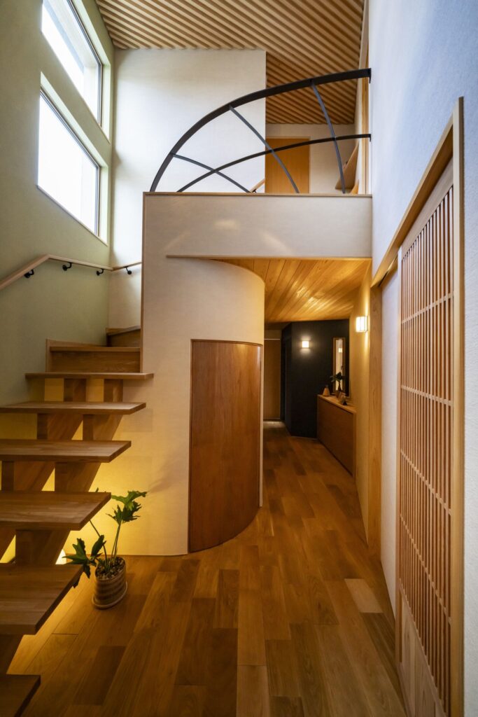 まるで旅館の離れへと向かうような趣をまとい、日常の中にさりげない非日常をもたらす階段室。