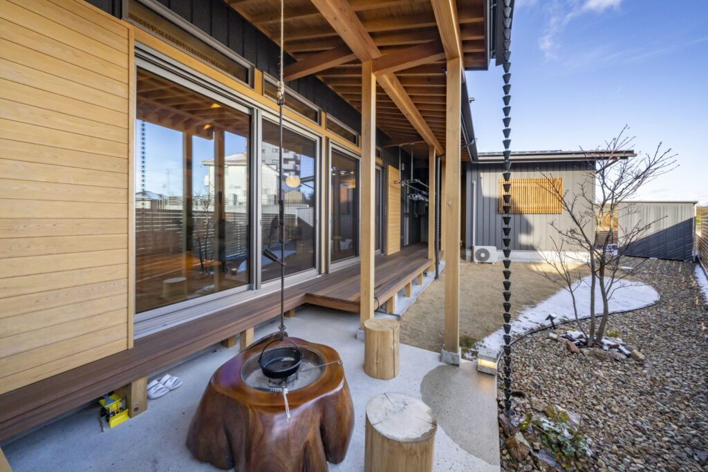 daimasaの特徴でもある深い軒の下には囲炉裏を設え、内と外がゆるやかにつながる設えとしました。