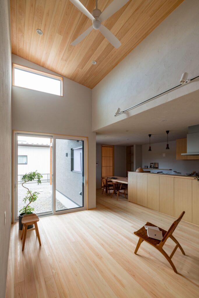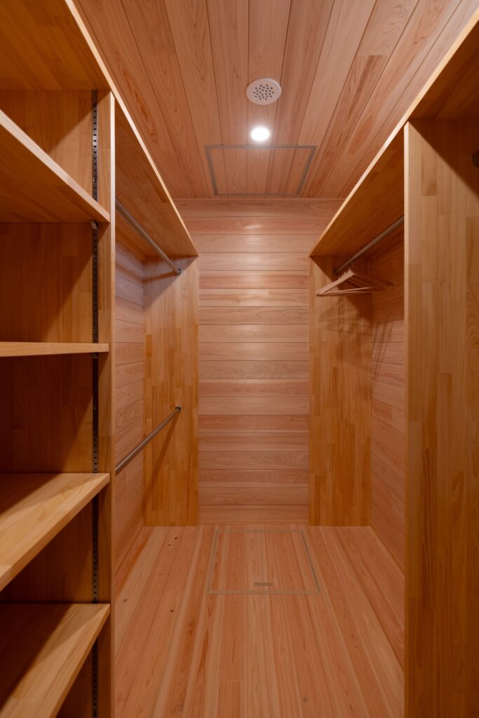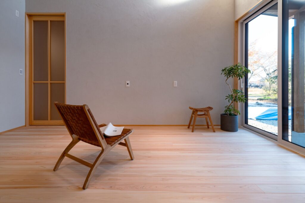 構造材から仕上材、家具・建具に至るまで、全て桧でつくり上げた「桧の平屋」。